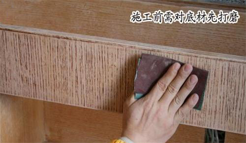 在涂刷前,我们要对木材基层进行仔细检查,对于基层表面的灰尘、斑点、油污、胶渍等物体,要清除干净。用打磨器或者木搓子垫上砂布,沿着木纹方向来回打磨,直至平整光滑,最后将粉尘清理干净。