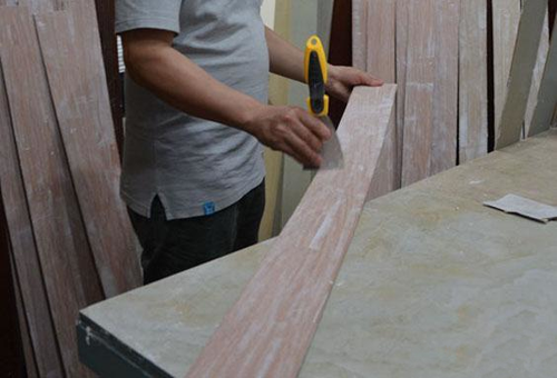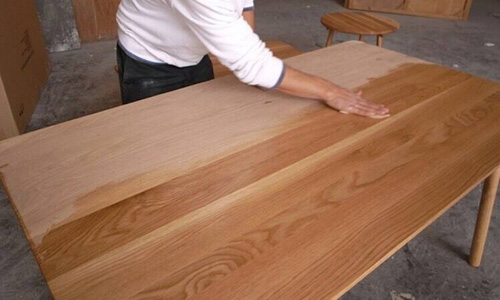 使用调配好的腻子,再用牛角板将腻子刮入钉眼、裂纹当中,等待腻子干透之后,使用砂纸顺着木纹轻轻打磨一遍。在打磨过程中,记住将钉眼以外的腻子完全磨掉,避免将钉眼扩大化,最后把粉尘清理干净。