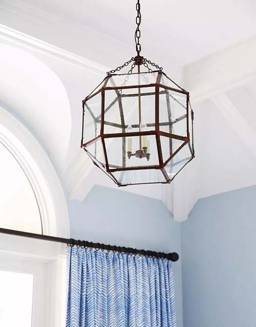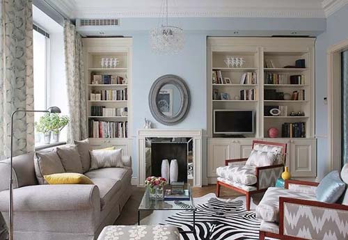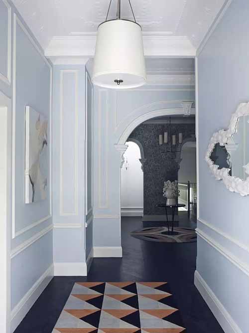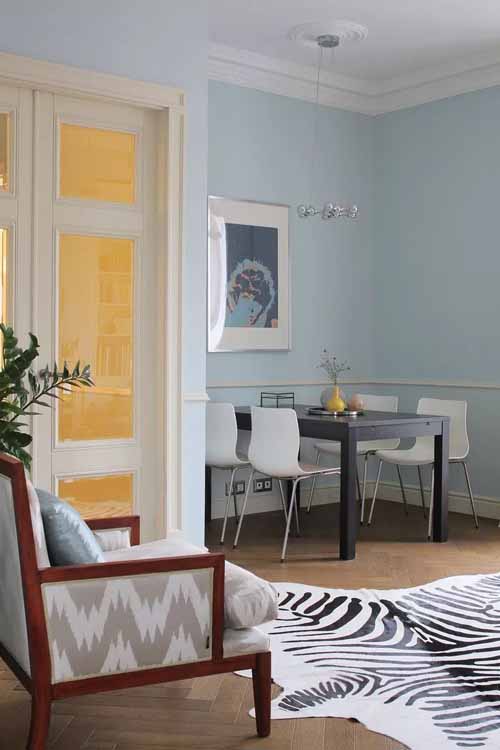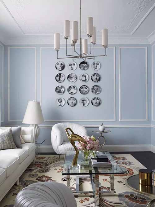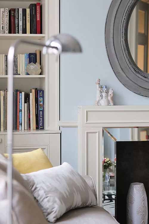 婴儿蓝墙面结合白色石膏线,纯净诗意的视感中充满优雅气质,搭配纹饰精致的白色天花板以及窗帘与沙发,明亮而纯透的质感将这份高贵与优雅气质极致强化。