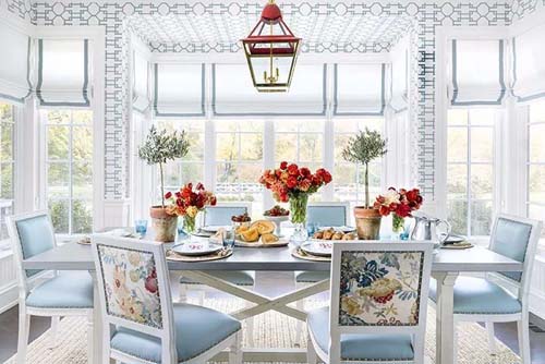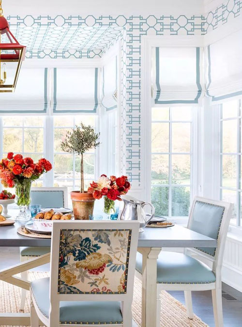 同色罗马帘的装饰将感官强化,而明亮的光线带入又令餐室内的一切都柔和起来。