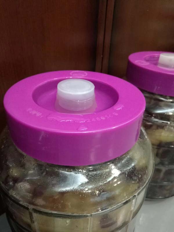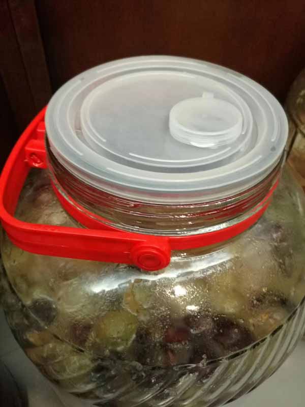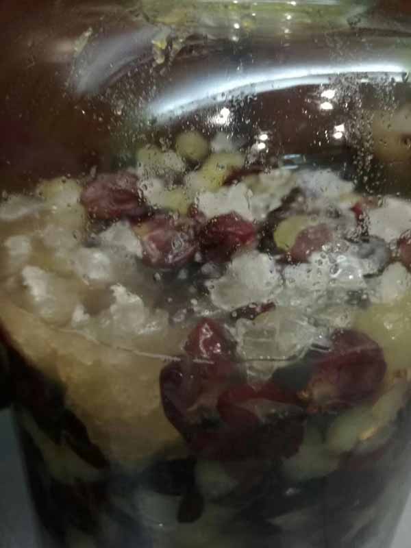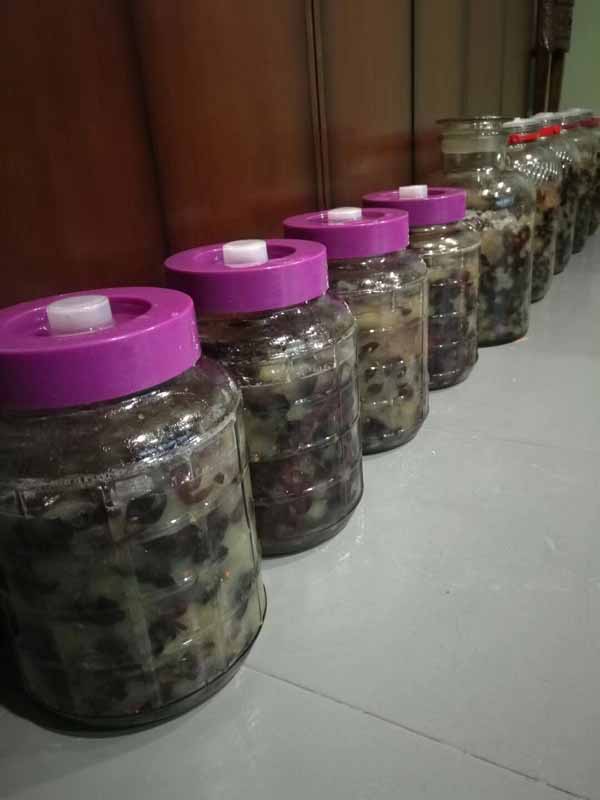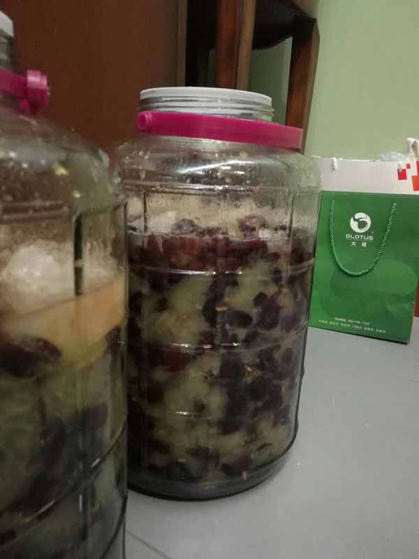 入坛:然将洗好的葡萄晾干水份,当外皮表面没有生水时,就到入坛了。准备好清洗干净的玻璃瓶,然后把葡萄一颗颗碾碎,果皮果肉分离,装入瓶中。记得不要装的太满,百分之七十五左右。然后按照每斤葡萄二两冰糖搭配一并放入,盖好盖子。盖子不要密封,需留一点空隙,让发酵时的气体排出。说到这里注意哦!冰糖最多二斤,要是放多了,你自己负责哦!